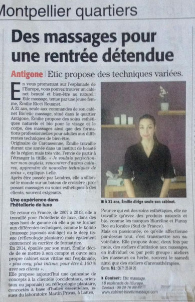 A 32 ans, seule aux commandes de son cabinet « Bio Etic Massage », situé dans le quartier Antigone à Montpellier, Emilie Ricci Rouanet propose des soins esthétiques naturels et bio pour le visage et le corps, des massages ainsi que des formations professionnelles pour adultes aux différentes techniques de bien-être. Portrait: